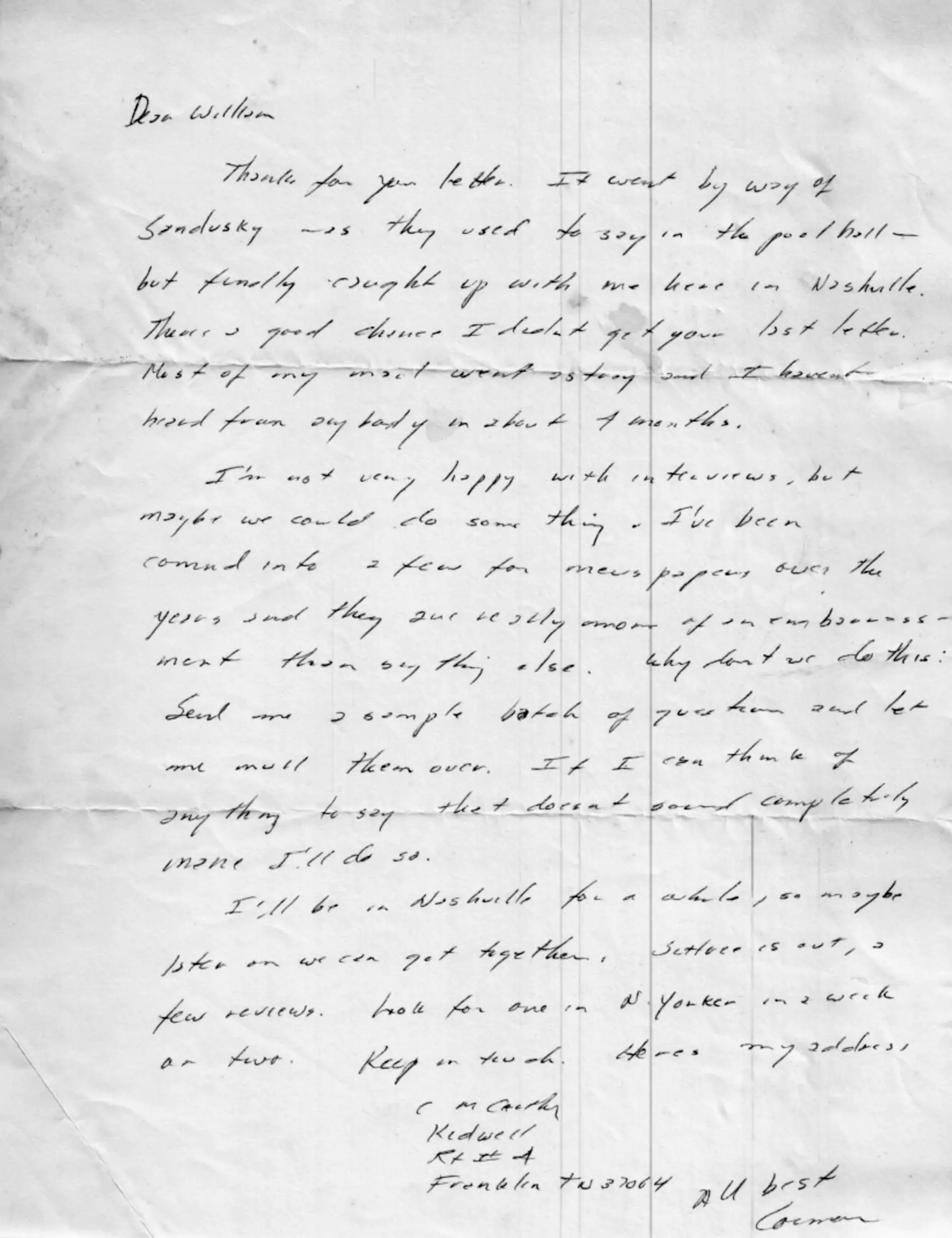 There were three extant letters from Cormac McCarthy in the William Gay archive. William sold one of the letters to raise money for the health care expenses of his youngest daughter after she was diagnosed with cancer. William approached his friend Ron Rash and offered to sell one of his letters from Cormac McCarthy. Ron was a good friend and ended up purchasing the letter at a time when it really helped William deal with a tough situation in his family. Ron Rash has indicated he plans to place the letter in the McCarthy archive.